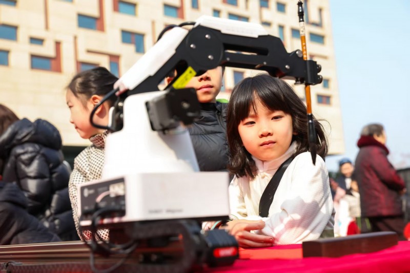 科技是本次春节活动最耀眼的“亮色”。智能机器狗身披红色“战袍”,随着新春的旋律跳起《一马当先》。它们动作整齐划一,时而作揖拜年,时而翻滚卖萌,引得围观市民笑声不断、掌声雷动。机械臂正悬腕挥毫,为市民书写着寓意吉祥的春联、旗开得胜机器人开展棋艺对决;妙笔生花机械臂为市民绘制简易素描肖像;随着机器的轻微嗡鸣,3D打印机打印出了孩子们爱不释手的新年“潮玩”。前沿科技融入年俗场景的创新,让“年味”在指尖触达了未来,为新春佳节装点上了新时代的科技氛围。