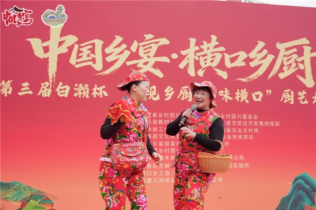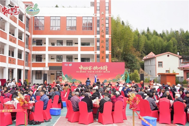 当天备受瞩目的“中国乡宴·横口养生宴”开席,宴席以“养生”为核心,精心设计了包含永春白鸭汤、茶油鸡、猪肚养脾散等十三道寓意吉祥的特色菜肴。宴席间,鼓舞、红歌、传统武术宋江阵、民间曲艺二人转等节目轮番上演,浓浓年味洋溢山村。