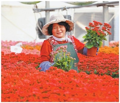 山东青岛即墨区灵山花卉文化产业园,花农进行管护、修剪作业。