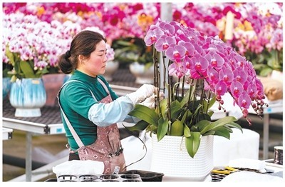 陕西西安高新区的卉杉生态科技有限公司园区内,工作人员在给蝴蝶兰定型。