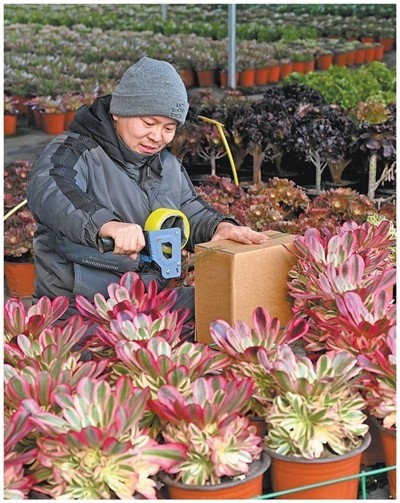 河北邯郸峰峰矿区彭城镇河泉村,村民在打包多肉植物,准备寄送给客户。