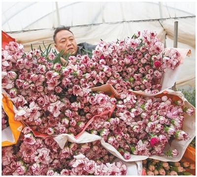 云南曲靖龙华街道的鲜花种植基地里,花农正在搬运康乃馨。这批鲜花将通过冷链运输,发往北方市场。
