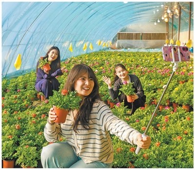 新疆乌鲁木齐达坂城区西沟乡馨怡花卉种植基地内,游客手持鲜花拍照。