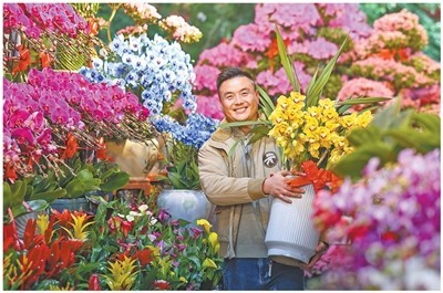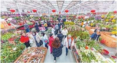 黑龙江哈尔滨香坊区花卉大市场,人们在挑选鲜花。