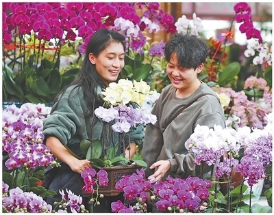 青海西宁市民在万佳花博园新春花市选购年宵花。