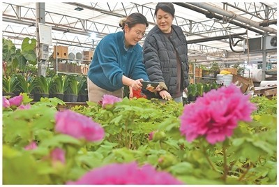 河南郑州陈砦花卉双桥基地内,市民正在欣赏催花牡丹盆栽。