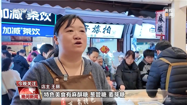 店主 王丽:特色美食有麻酥糖、葱管糖、麦芽糖,还有义乌红糖,义乌红糖麻花这些,最受欢迎的是红糖麻糍。