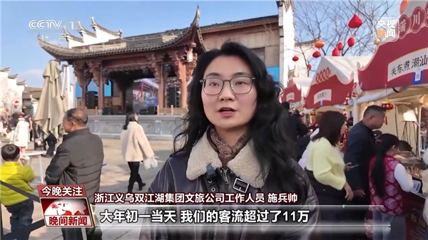 浙江义乌双江湖集团文旅公司工作人员 施兵帅:大年初一当天,我们的客流超过了11万,去年只有9万,增长了将近30%,随着春晚效应的持续放大,预计春节假期期间客流会实现高位增长。