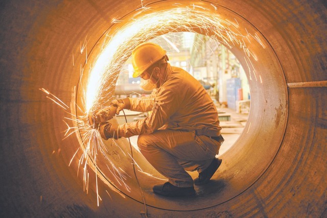 2月24日,在四川眉山天府新区中建钢构四川有限公司车间,工人赶制钢结构产品。当日是春节假期结束后的第一个工作日,各地企业纷纷开工生产。 新华社发