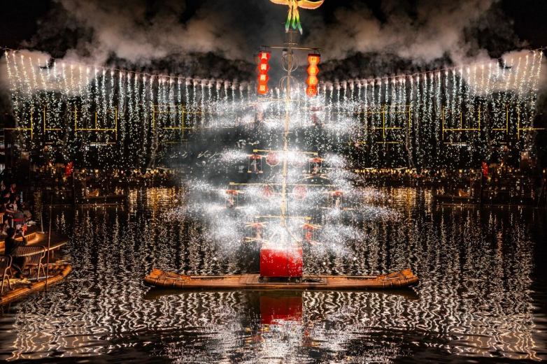 在年货节基础上,南岳里同步推出“非遗新春·国潮百戏”系列演艺活动。正月期间,高跷巡游、天官赐福、烟花木偶戏、鱼灯巡游、非遗踏春等节目轮番登场,打铁花、瀑布烟花等夜间演出点亮湖面夜空,为年货节增添浓厚节庆氛围。