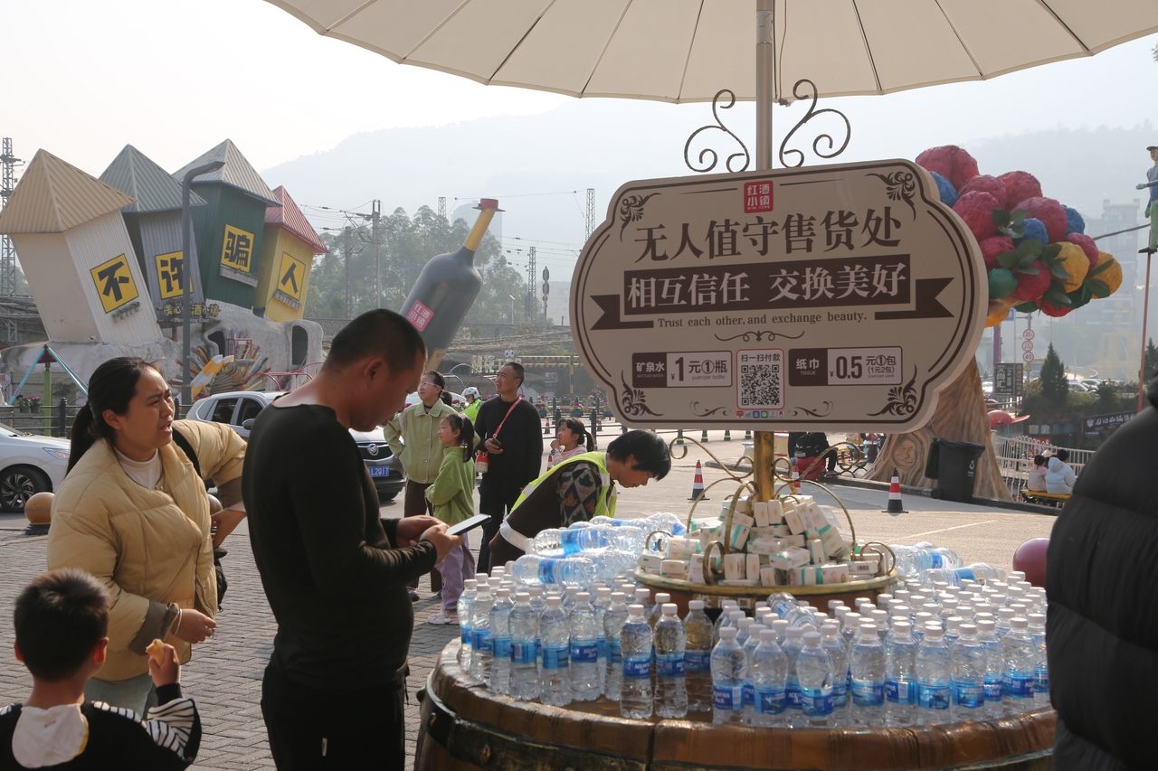 马年新春假期,8D重庆游人如织、年味浓郁。在各景区客流持续高位运行的同时,一道温暖而动人的风景持续上演:景区内无人值守矿泉水、便民商品摊位前,游客自觉扫码付费、诚信取用;商家诚信经营、游客文明出游,双向奔赴的暖心场景,让文明旅游与放心消费成为节日最亮眼的名片。