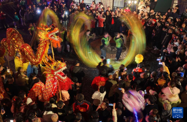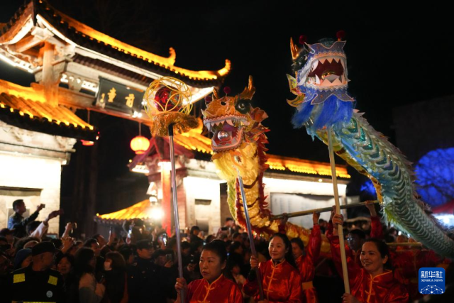 2月28日,舞龙队在浙江省湖州市德清县乾元镇第26届浙北乾龙灯会上巡游展演。
