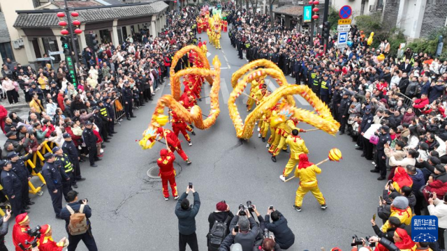 2月28日,游客在浙江省湖州市长兴县画溪街道观看“踩街”表演。