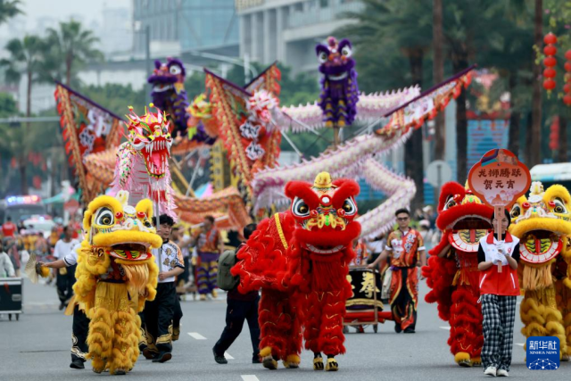 3月1日,广东省肇庆市端州区举行“广府风韵汇星湖 多彩非遗闹元宵”2026肇庆广府文化庙会非遗巡游展演活动。这是南狮表演。
