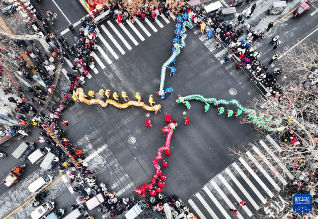2月28日,舞龙队在浙江省湖州市德清县乾元镇第26届浙北乾龙灯会上巡游展演(无人机照片)。