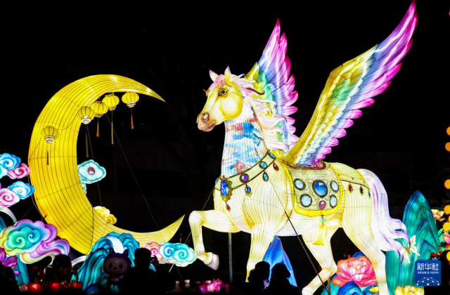 3月1日,人们在甘肃省敦煌夜市举办的敦煌灯会上观赏花灯。