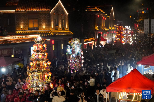 3月2日,浙江省宁海县前童古镇举行传统元宵行会,人们抬着鼓亭参加巡游。