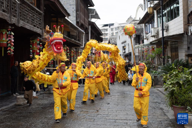 3月2日,龙灯队在重庆市秀山土家族苗族自治县西街巡游。
