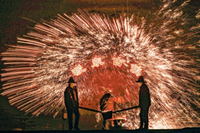 3月2日,民间艺人在河北省蔚县暖泉古镇进行“打树花”表演。 武殿森摄