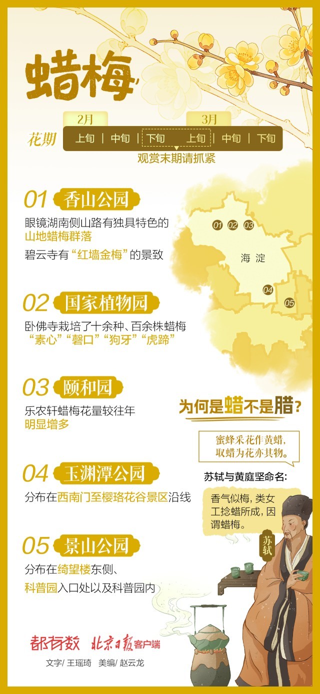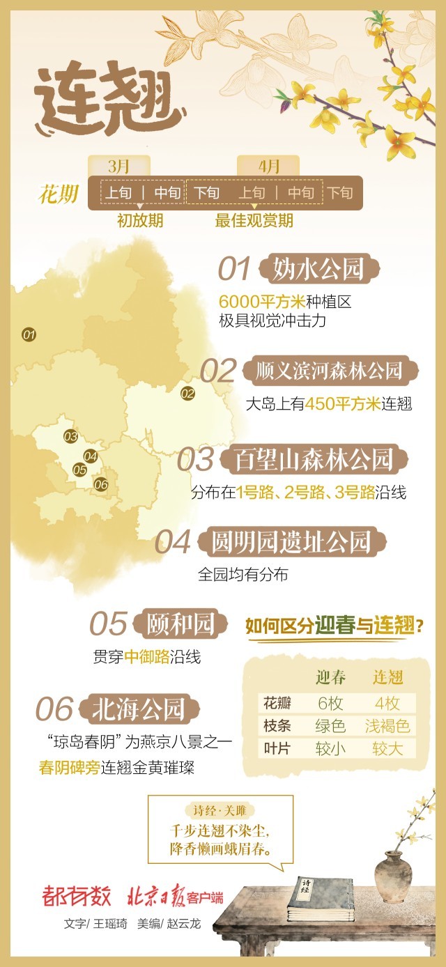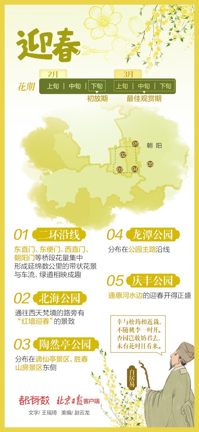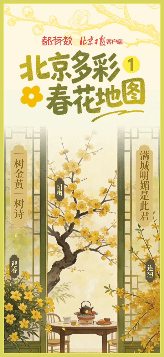 雪后初霁,北京气温即将回暖。春天的京城有多少种颜色?答案就藏在街角巷尾的树梢上、公园角落的花影里。本端从今天起推出“北京多彩春花地图”,以黄、粉、白、紫、彩五个色系,按花期顺序,带您沉浸式领略绚烂春意。第一期,让我们一起欣赏早春悄然绽放的黄色系花朵——