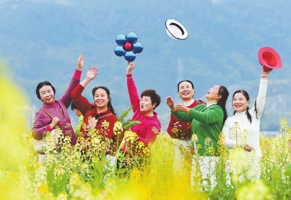 3月5日,蓝山县塔峰镇竹市村,游客在七彩油菜花田踏春赏花。黄春涛 摄(湖南图片库)