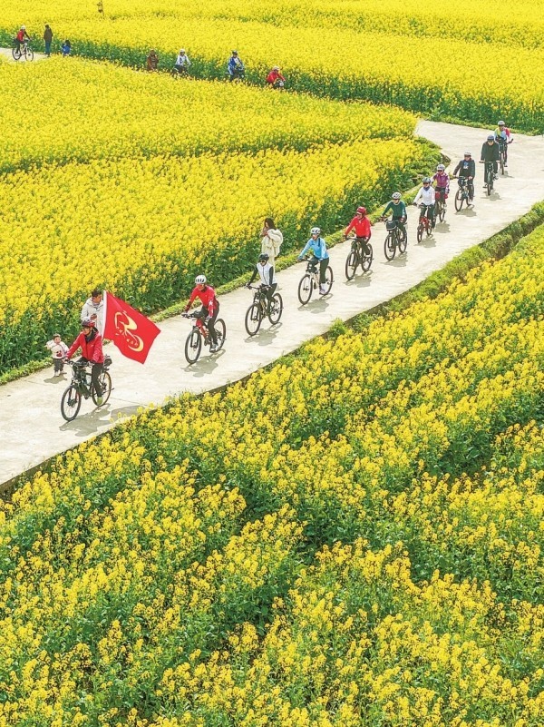 3月5日,道县祥霖铺镇两河口村,骑行爱好者在油菜花田骑行。