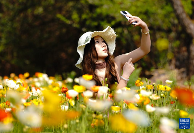 3月10日,一名游客在昆明名花谷的虞美人花丛旁拍照。