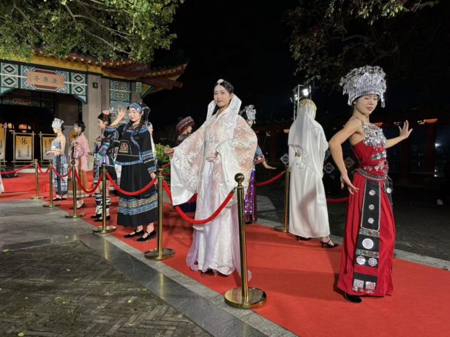 随着音乐声起,模特们身着各族盛装依次登台。首先是宽袍大袖、交领右衽的汉族服饰,尽显礼仪之邦的温文尔雅;紧接着是尚青蓝、配银铃的壮族服饰,仿佛把壮乡山水穿在了身上;线条简练的满族旗袍勾勒出东方女性的含蓄之美,头戴“风花雪月”帽的白族女子款款走来,垂下的缨穗随风轻摆。