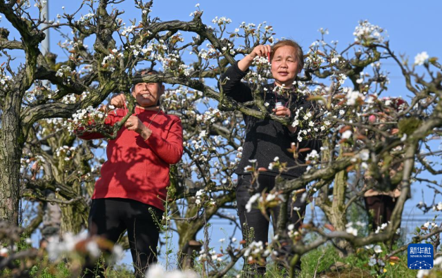 3月11日,村民在重庆市永川区尖山村给梨花进行人工授粉。