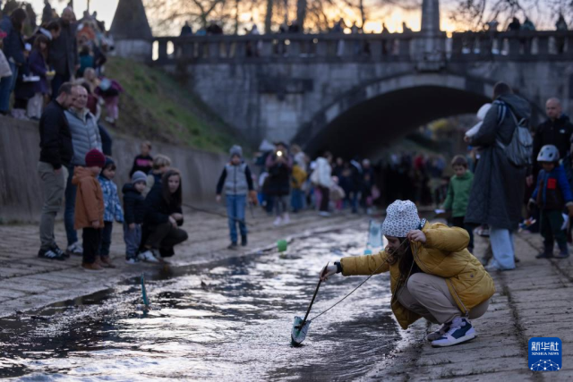 3月11日,在斯洛文尼亚卢布尔雅那,一名女孩将自制的小船放在溪流中。