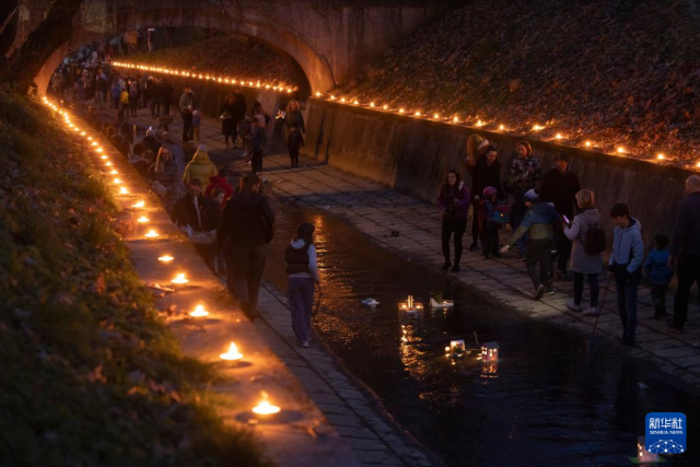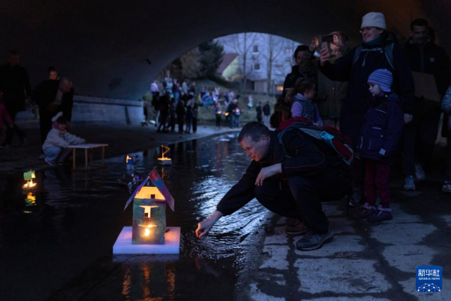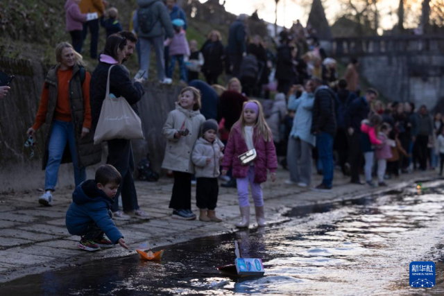 3月11日,在斯洛文尼亚卢布尔雅那,人们将自制的小船放在溪流中。