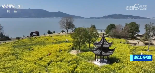 随着气温回升,在浙江宁波鄞州区的东钱湖景区,湖畔的油菜花、梨花竞相开放,吸引众多市民游客前来踏青赏春。