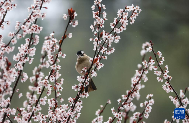 3月16日,小鸟在贵州省铜仁市玉屏侗族自治县皂角坪街道茅坪村的花间觅食。