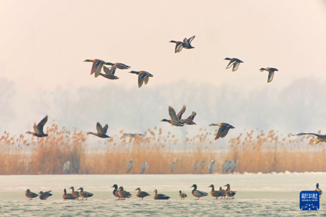 这是3月17日在黑龙江省齐齐哈尔市拍摄的野鸭群。