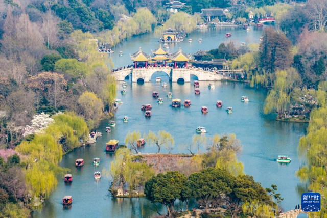 3月15日,游客在江苏扬州瘦西湖风景区赏花游玩(无人机照片)。