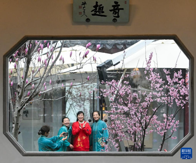 3月18日,游客在江苏省扬州市何园景区赏花拍照。