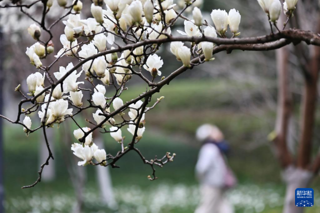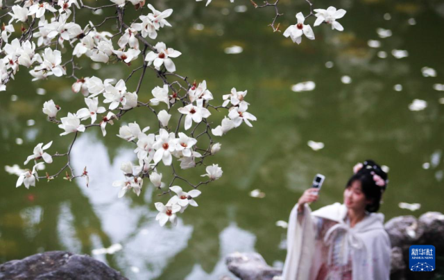 3月18日,人们在江苏省昆山市亭林园赏花拍照。