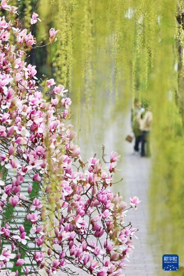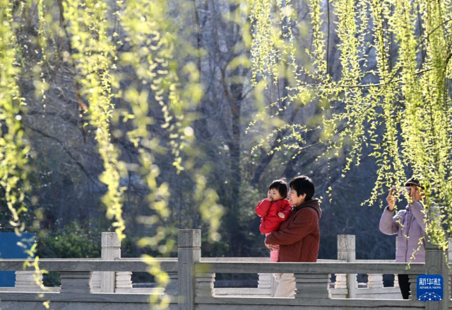 3月18日,市民在河北省石家庄市元南公园散步,享受春光。