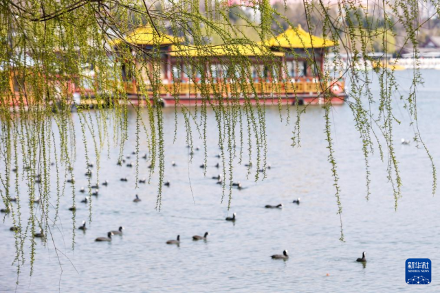 3月19日,在山东省济南市大明湖,杨柳依依,一群白骨顶鸡畅游湖水之中。