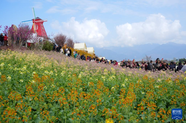 3月18日,游人在陕西省汉中市汉台区皇塘水乡景区彩色油菜花田赏花观景。
