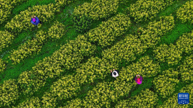 3月19日,茶农在贵州省铜仁市江口县坝盘镇挂扣村生态茶园采摘黄金芽春茶(无人机照片)。