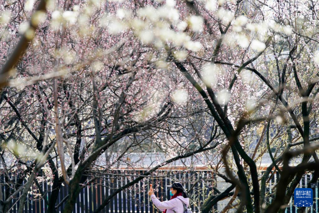 3月19日,游客在北京国家植物园赏花拍照。