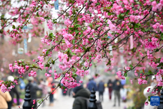 3月18日,游人在河北省石家庄市桥西区环城水系绿地拍摄山桃花。