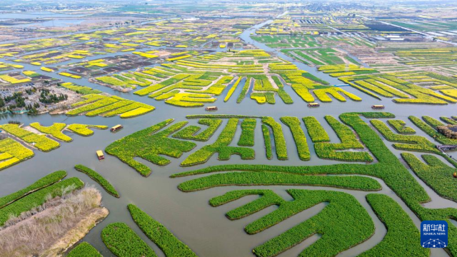 3月19日,游客乘船在江苏省兴化市千垛景区赏花游玩(无人机照片)。
