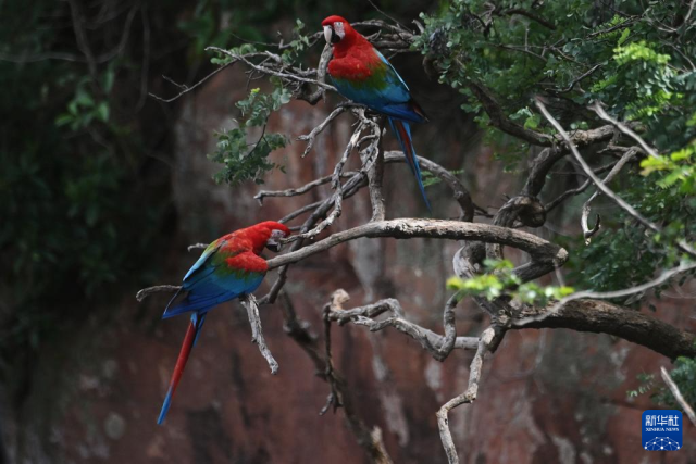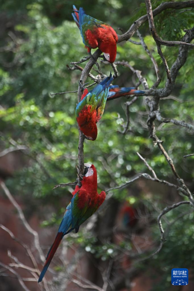 3月19日,在巴西南部南马托格罗索州雅尔丁市的“金刚鹦鹉洞”,金刚鹦鹉在树枝上憩息。