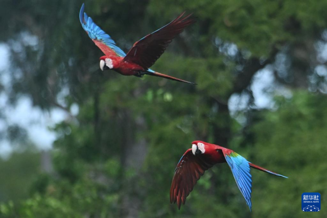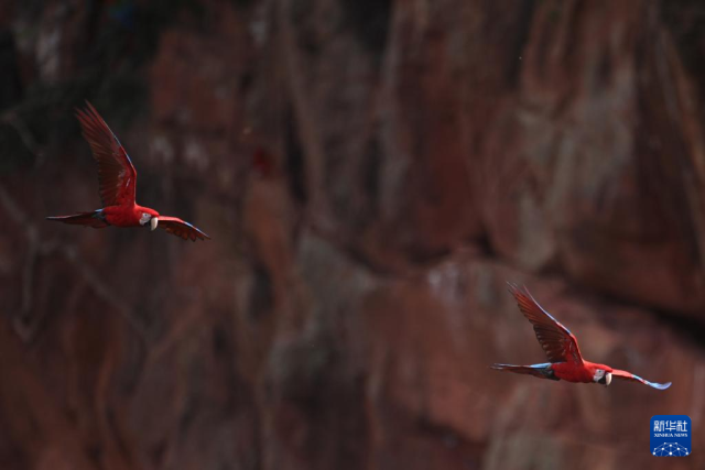 3月19日,金刚鹦鹉在巴西南部南马托格罗索州雅尔丁市的“金刚鹦鹉洞”飞翔。