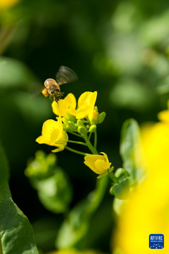 ??3月20日,一只蜜蜂在花间采蜜。