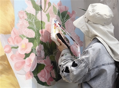 在一处接近完工的彩绘墙前,不少路过的市民游客纷纷驻足围观,拿出手机拍照打卡。戴着防晒帽的画师胡钰婷一边专注勾勒线条,一边告诉记者:“很多游客看到还没完工的画作就特意停下来打卡,大家随口的称赞和认可,让我们干活儿都更有劲头了。”