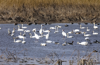 “近年来,每年我都能观测到白鹤,但这次集中出现近百只是头一次。”七里海湿地自然保护区管委会工作人员韩克武介绍,在2021年以前,白鹤在七里海地区偶有发现和记录,但数量非常稀少,属于零星出现。从2021年开始,白鹤的发现数量呈现逐渐增多的趋势,去年,记录到的白鹤小群体约有十几只。而近年来的最高纪录也仅为二十余只。此次观测到97只白鹤齐聚,实属罕见。这群珍贵的白鹤年复一年如期而至,它们正与七里海结下越来越深的缘分。