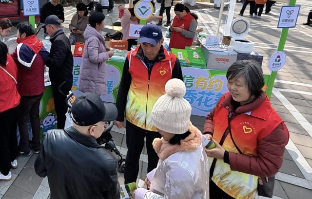 活动现场中,南京(国家)粮油商品交易市场工会、江苏省粮食和物资储备局“金谷银辉”志愿服务队等充分发挥粮食领域的专业优势,向来往的市民游客积极宣传“水韵 苏米” 公用品牌,在活动展示区想群众讲解“水韵·苏米”种植优势、营养价值、品质特点,发放宣传手册并协助开展爱粮节粮、粮食安全知识科普活动。江苏省粮食和物资储备局“金谷银辉”志愿服务队的老党员志愿者们充分发挥自身深耕粮食领域的专业优势、经验优势、银发优势,走上一线、服务群众,向来往的市民和游客积极宣传“水韵 苏米”公共品牌,助力核心企业推广优质大米,用实际行动践行雷锋精神,为守护粮食安全、助力乡村振兴、讲好江苏粮储故事贡献余热力量。